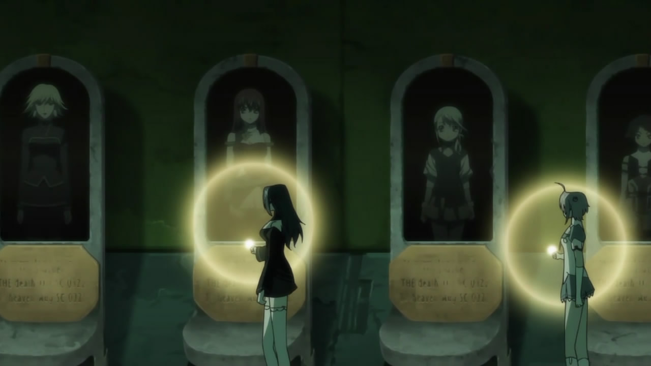 另一點要說的就是GOTT內出現的奇怪的ES Member名人堂(Hall of Fame),其中出現了大家也很熟悉的エクレール與リュミエール(當然兩人對牆上的兩人也是沒反應),不過重點是只有アールヴ與ドヴェルグ兩人有刻上死亡日期,如果這麼推算的話,GOTT應該是在GTO建立後才棄置嗎?而棄置時間是比第一集的那個事件更後來的位置…?相信這個謎題暫時只有トゥイードゥルディ與トゥイードゥルダム兩姊弟才會知道吧?(呃,該也不會是同名的別人吧…囧)