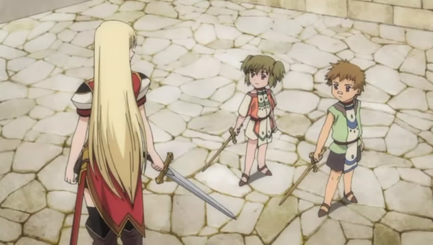 稍後,アロウン想要整理從帝國強盜回來的東西卻無從入手,帝國的東西當然問帝國的人,也就是オクタヴィア了。被指定尋找她的アルサル,終於看到オクタヴィア,原來她在向兩個小孩教授劍術。