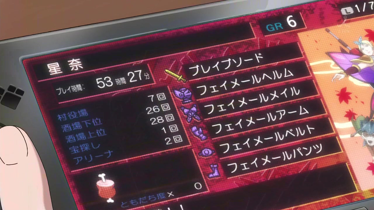 不管如何,這一集的遊戲再現度真的很高,實在高到不行XDD。夜空介紹所謂的PLAYING STATES PORTABLE也就算了,小鷹還要故意地說出「PSPだろ」這一句,聽到的時候立即噴茶(抹螢幕)。遊戲是模仿Monster Hunter Portable這一點不用多說,重要的是內裡的怪物和場景也悉數重現,啊,不得不說的是星奈拿著的竟然就是MHP3特別版主機,連這一點也做出來的製作組實在GJ啊,至於小鷹的粉紅色主機,小說裡是說他是臨時向妹妹小鳩借回來的,所以也沒怎碰過是很自然的事www。先說說星奈的數據和遊戲時間…。