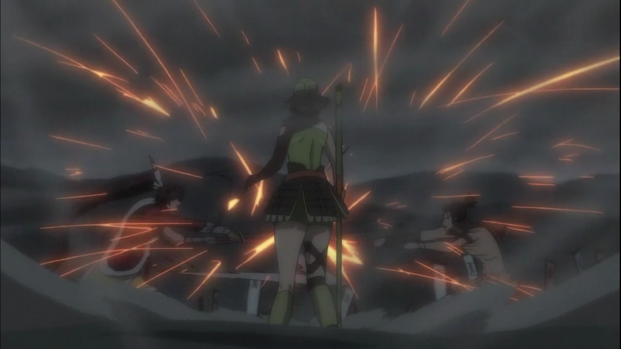 回說這一次的戰事,實際上這集的戰事的藍本是「手取川之戰」。手取川之戰可以說是織田軍少有的敗戰之一(另一場比較有名的可能是金崎撤退?不過那是被長政背刺之下才撤退的啊(啥)。而動畫中也只是以其作為藍本創作而已,歷史上是上杉軍先攻打能登國,織田軍是應畠山家要求而出戰,結果因為兩個統帥(勝家和秀吉)不和才導致敗戰,吧,跟動畫中「上杉軍主隊趁前田軍不備攻打加賀國迫其撤退」完全是兩碼子的事XDD。