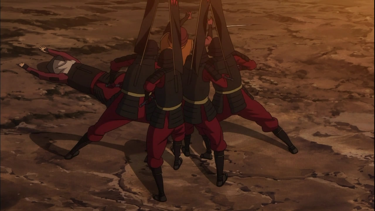 就算是這麼說,那個,呃,豐臣秀吉的能力會不會太恐怖了啊,看著他的一舉一動,由一個人打退海水、空手接下砲彈、把長曾我部打上半空完全壓制,真是覺得「嘖,你一個人也能夠統一天下了吧,用得著招兵買馬嗎!」。站在觀眾角度的我覺只能目瞪口呆,真難想像在戰場上的人會怎麼想,由一開始就已經逃掉了吧,可能。最後元親被水淹沒的樣子,還是套用一句,沒看到屍體就沒有死!(喂