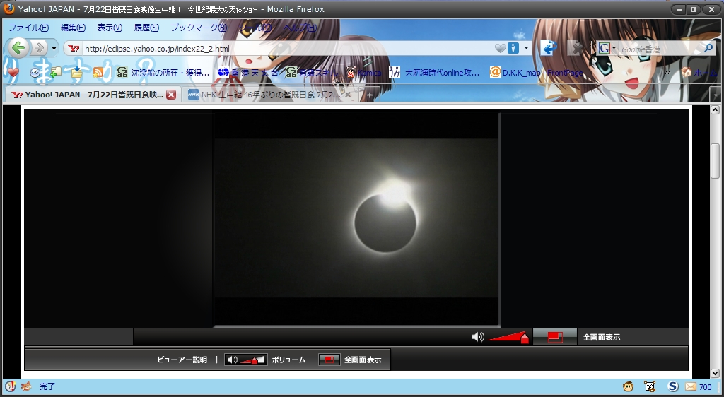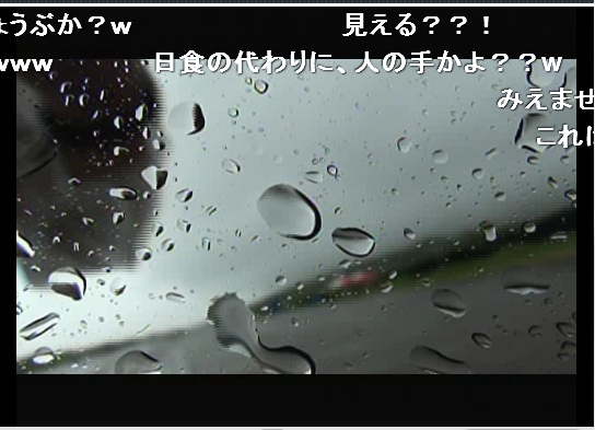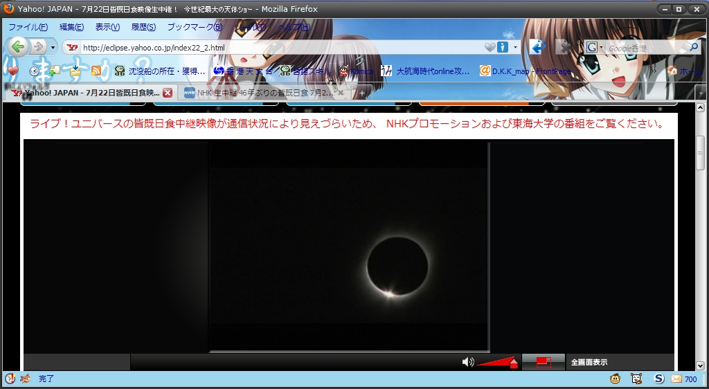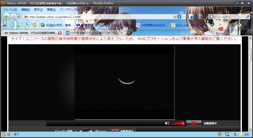 看著已經吃了一半的太陽,才剛起床的我就唯有寄托於日本了。果然日本不負我所望,Yahoo! JAPAN有硫磺島上空(NHK)的直播,ニコニコ也有各種類的現場直播,其中一個很有趣的直播,雖然似乎在觀測到日食的地方進行,不過天氣並不好,結果該主持人好像被弄壞了2台攝影機(默)。可是該主持人最後還是拍到日全食中途天色全暗的景象,可說是安慰獎…吧XD"。