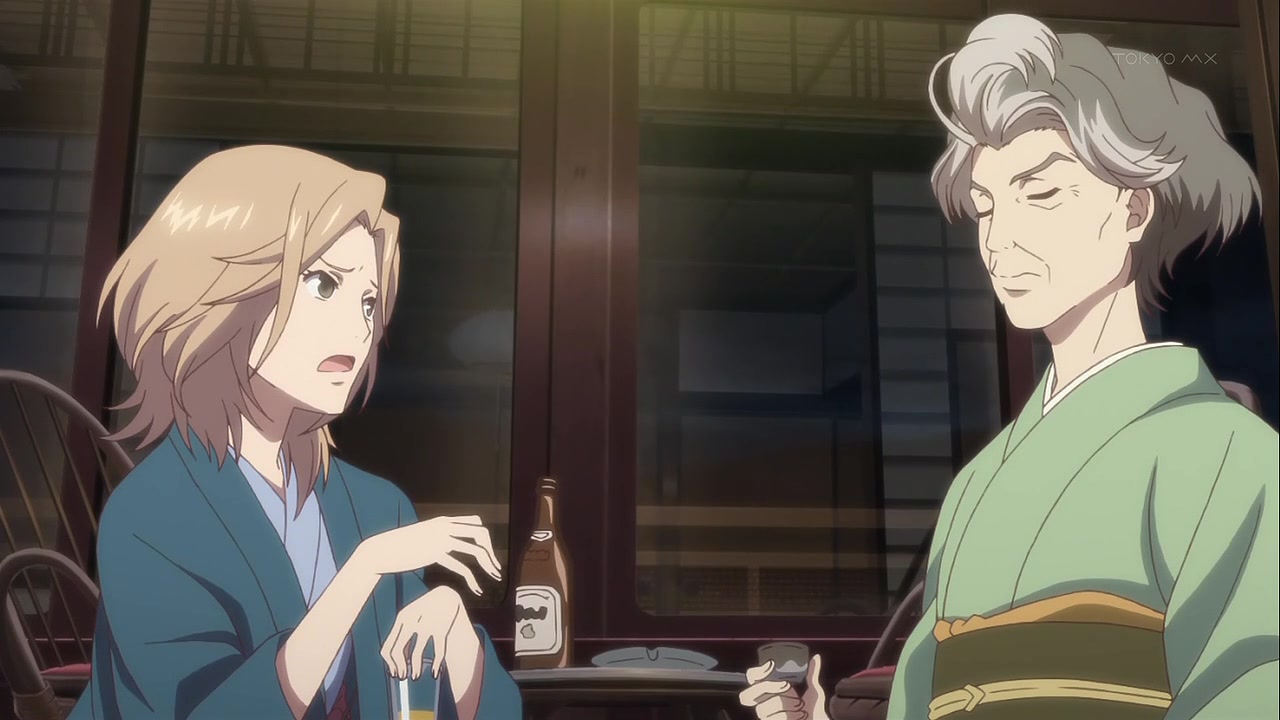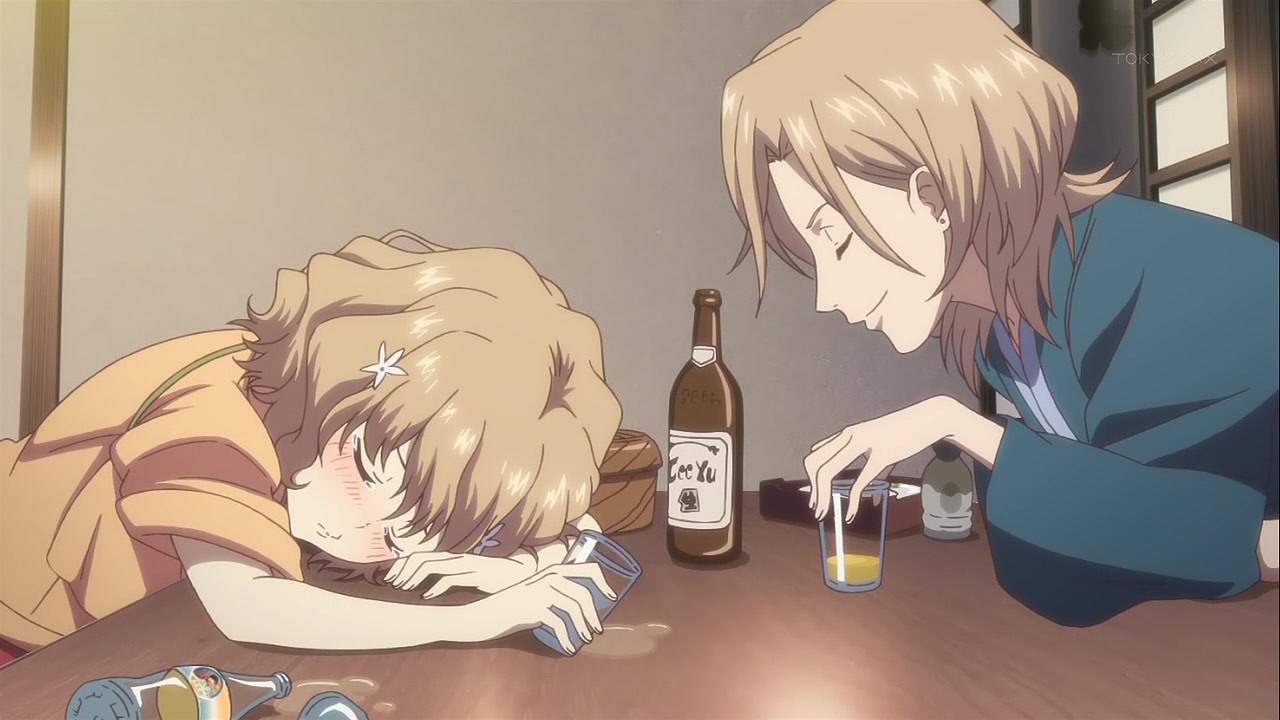另一方面,スイ還是老樣子的老神在在,彷彿已經把所有事情看透一樣,連皐月跟著緒花一起去喜翠莊的用意也知道般,當皐月呼叫酒水時就直接與皐月(和緒花)一起對談,可說是有其母必有其女也必有其孫女啊(啥),可憐縁又再一次(?)被冷落,要繼續努力啊縁!…話說回來,回想片段中皐月還是用伊藤かな恵來配音…而且聲調還是一樣,一時間還真不習慣啊(茶)。