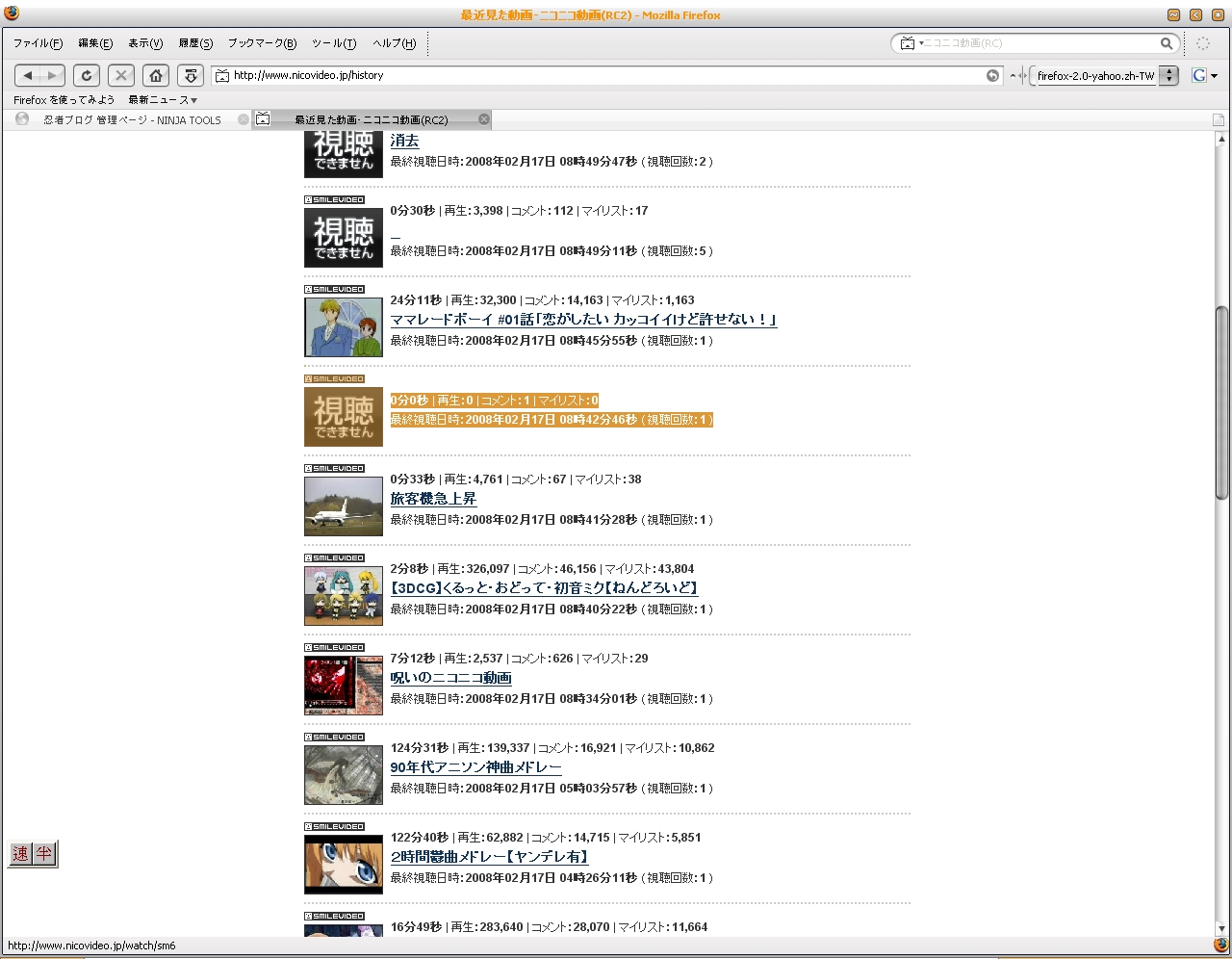 200802172238.jpg話說今早跟平常一樣在ニコニコ動画找影片看的時候,想試著由1開始(就是影片的編號)看看什麼動畫,以smilevideo來說,這個動畫應該是現存編號最小的影片(全網站則是這個最舊)。但,今早卻突然找到了編號sm6的動畫,說是「動畫」但是個0分0秒的動畫,而且是0觀看0留言0清單的「動畫」…後來我想再看一次但已經看不到了…(看過的證據圖片,無修改)