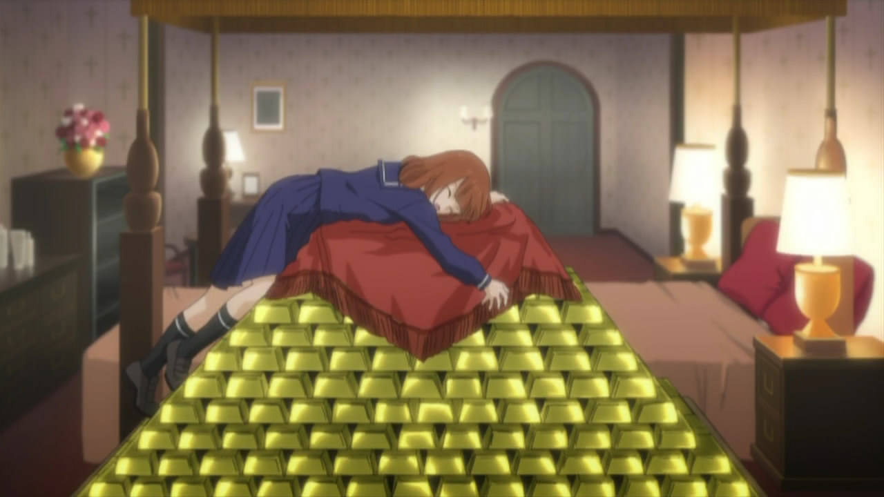 絵羽來到了一處秘密的地下室,門上恰好出現紅字的碑文段落。推門一看,裡面是一間裝潢華麗的個室,而室內的正前方…竟然就放著整整10噸的黃金!