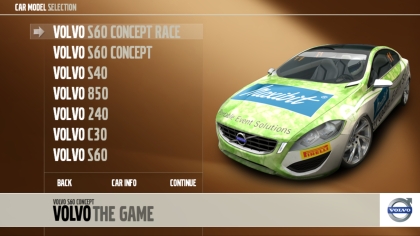 為了宣傳旗下的新車S60 Concept,Volvo車廠與推出Race07 - The WTCC GameGTR Evolution賽車遊戲的SimBin公司合作推出這個名為《Volvo the Game》的遊戲,讓玩家率先體驗Volvo S60 Concept。雖然是免費下載,但遊戲製作並不馬虎,遊戲中除了主角的S60 Concept外,還有如上圖般其餘6款車可以選擇。賽道方面共有兩條, 位於瑞典(Volvo是瑞典車廠XD)的Gothenburg Eco Drive Arena 及位於烏克蘭的Chayaka,其中Chayaka更是首次於電子遊戲中登場。