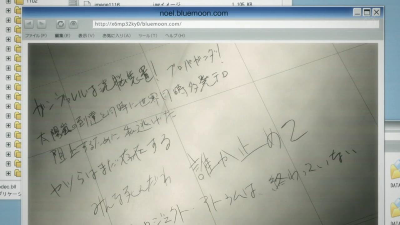 回到主題,フラウ的母親留下的這些訊息到底孰真孰假?就算有著她的字跡、慣用紙、以及親筆簽名,又是不是能百份百肯定是她的血淚(?)控訴(「ガンヴァレルは洗脳装置!プロパガンダ!」,一個自己監督的血汗作品竟然本來是別人的政治宣傳!?)呢,還有最重要的一點是,到底是誰把這段理應是被禁止的東西再次曝露在大氣之下?影片本身又是不是フラウ母親的遺作?一切一切還是一個謎…。